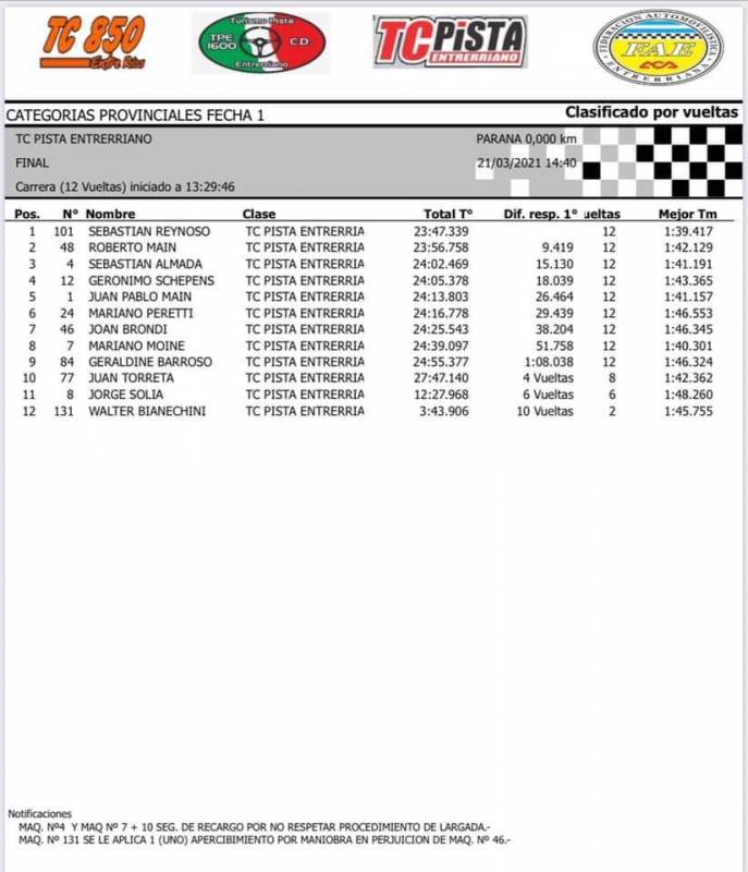 Luego en la técnica sancionaron a Reynoso y lo relegaron al último lugar de la grilla, mientras que al basavilbasense le permitían avanzar un puesto, al 2º. Así con Mariano Moine en pole position; Sebastián Almada en el 2º lugar y detrás de ellos Roberto Maín y Juan Carlos Maín, se lanzó la carrera que gracias a un par de relanzamientos no fue lo entretenida que se esperaba, que sirvió para que Reynoso demostrara para lo que está.