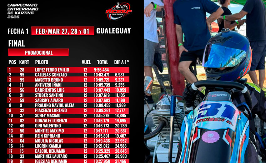 Así, Santino cerró la jornada inaugural con un debut prometedor en una nueva etapa deportiva, demostrando que el cambio de categoría no le pesó y que el 2026 lo encuentra listo para seguir creciendo dentro del karting entrerriano.