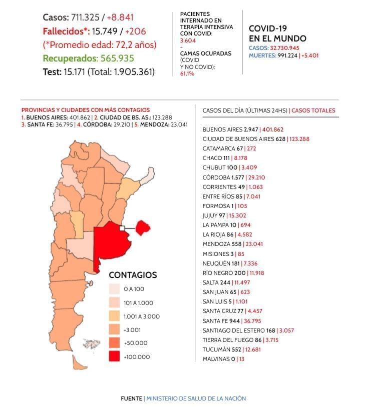 En lo que respecta a los 8841 contagios del último día, 2947 son de la provincia de Buenos Aires, 628 de la Ciudad Autónoma de Buenos Aires, 67 de Catamarca, 11 de Chaco, 100 de Chubut, 1577 de Córdoba, 49 de Corrientes, 85 de Entre Ríos, 1 de Formosa, 97 de Jujuy, 10 de La Pampa, 86 de La Rioja, 558 de Mendoza, 3 de Misiones, 181 de Neuquén, 200 de Río Negro, 244 de Salta, 65 de San Juan, 5 de San Luis, 77 de Santa Cruz, 944 de Santa Fe, 168 de Santiago del Estero, 86 de Tierra del Fuego y 552 de Tucumán.