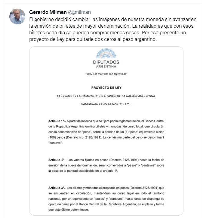 “El gobierno decidió cambiar las imágenes de nuestra moneda sin avanzar en la emisión de billetes de mayor denominación. La realidad es que con esos billetes cada día se pueden comprar menos cosas. Por eso presenté un proyecto de ley para quitarle dos ceros al peso argentino”, dijo el legislador en su cuenta de Twitter.