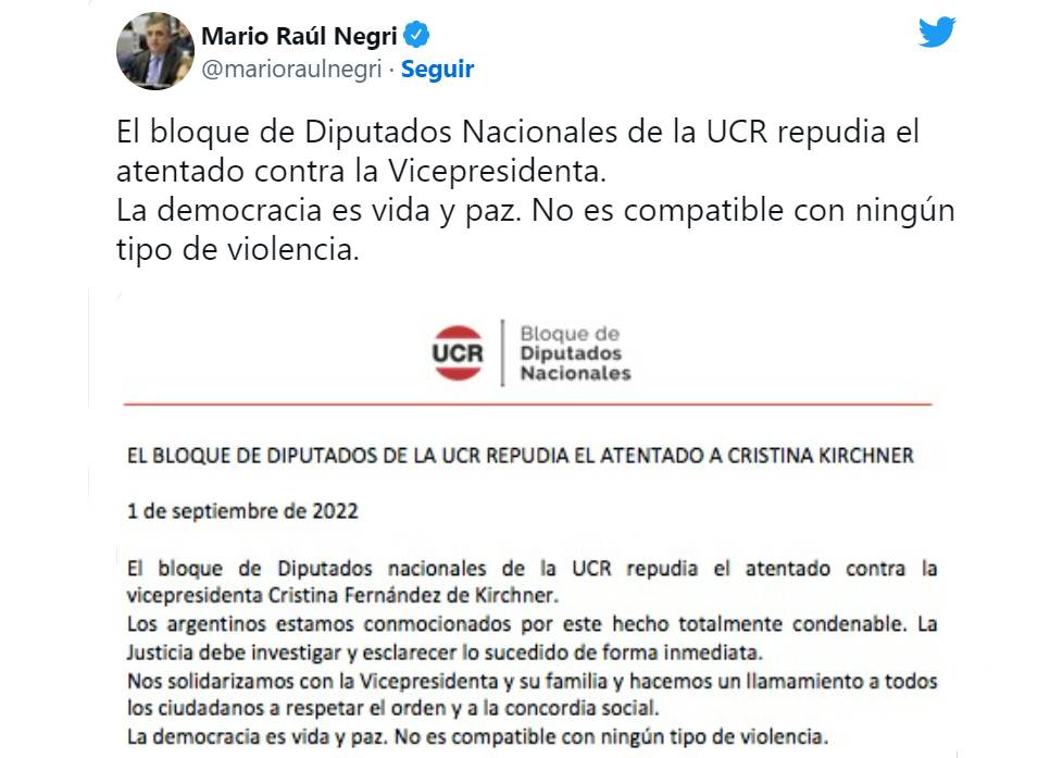 Negri condenó y repudió "categóricamente el atentado contra la Vicepresidenta". "La Justicia debe esclarecer el hecho inmediatamente. Lo que acaba de suceder es gravísimo. La democracia exige paz. No a la violencia”, expresó y minutos después compartió además el comunicado de su bancada.