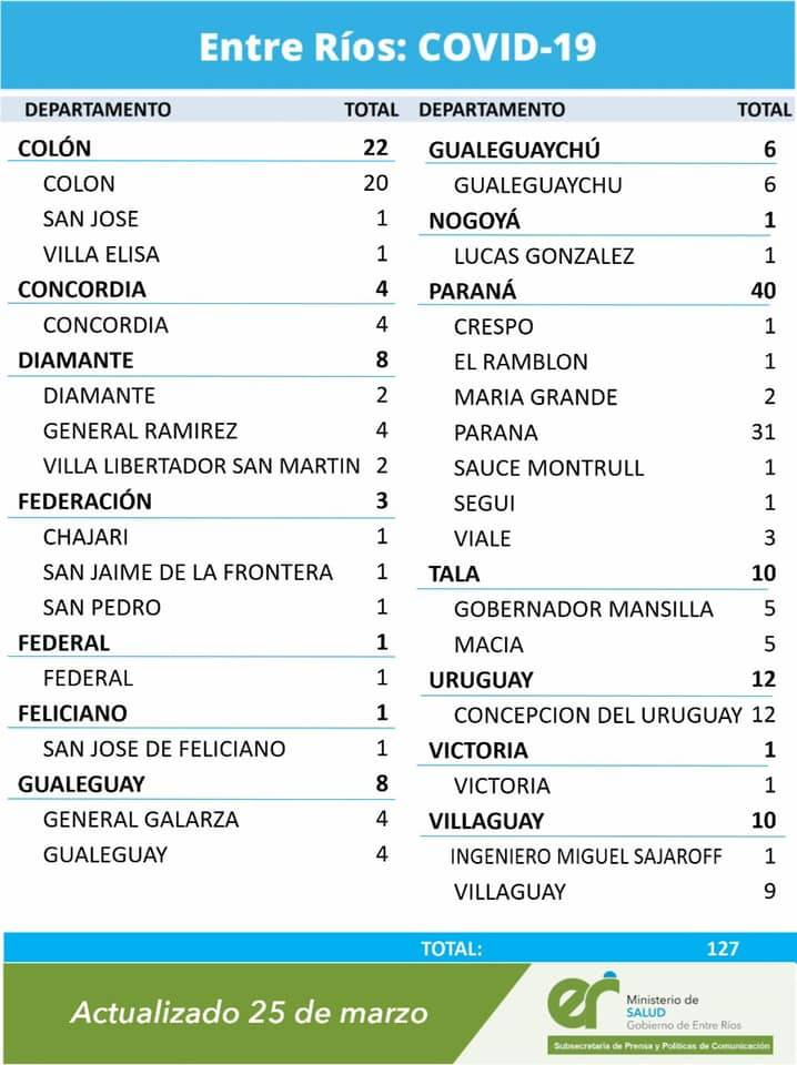 Salud | Según el Ministerio de Salud de la provincia este jueves se registraron 127 nuevos casos, de los cuales 12 son del Departamento Uruguay.