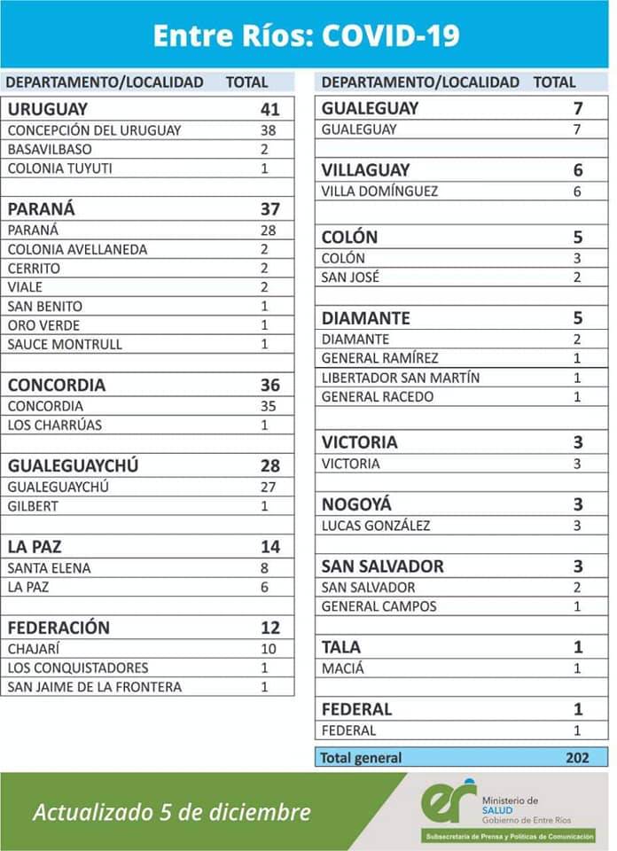 A partir de los datos reportados al 5 de diciembre de 2020 por el área de Vigilancia Epidemiológica del Ministerio de Salud, en Entre Ríos se han sumado 202 casos de coronavirus.