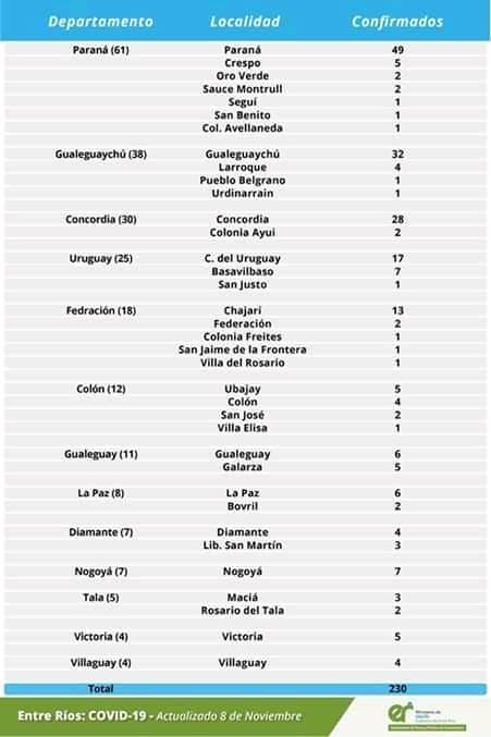 Salud | El área de Vigilancia Epidemiológica del Ministerio de Salud, confirmó que en Entre Ríos este domingo se registraron 230, de los cuales 7 corresponden a vecinos de Basavilbaso de los 25 registrados en el Departamento. El número de casos confirmados, desde que comenzó la pandemia asciende a 18.419 casos.