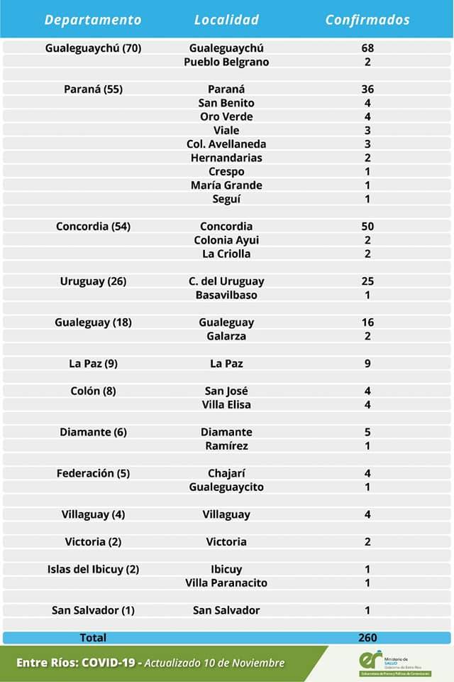 El área de Vigilancia Epidemiológica del Ministerio de Salud, confirmó que en Entre Ríos este martes se registraron 260 nuevos casos de coronavirus.