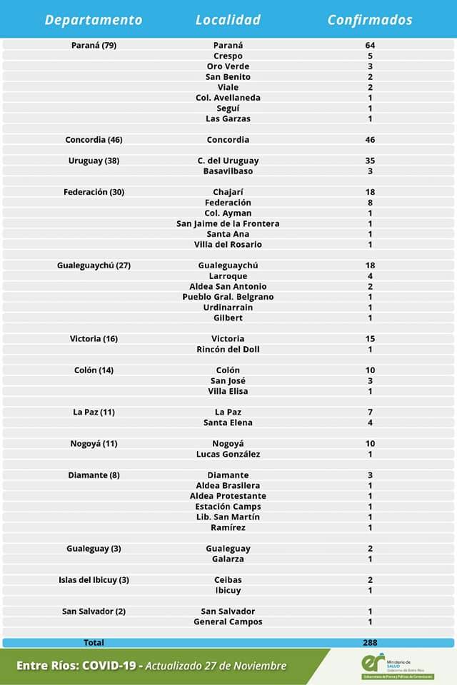 Salud | El área de Vigilancia Epidemiológica del Ministerio de Salud, confirmó que en Entre Ríos este viernes se registraron 288 nuevos casos. El número de infectados, desde que comenzó la pandemia, asciende a 23.325 casos.
