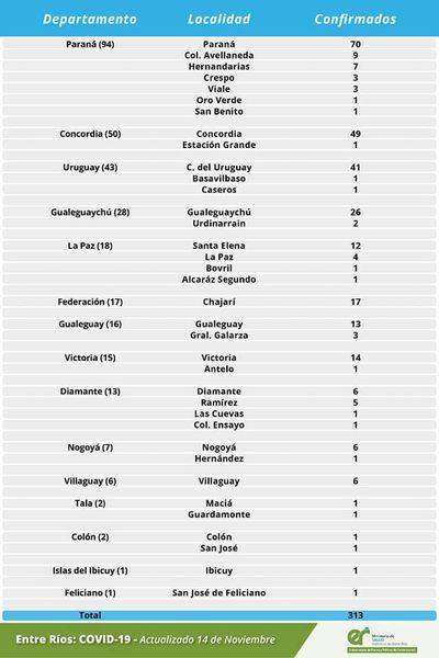 El área de Vigilancia Epidemiológica del Ministerio de Salud, confirmó que en Entre Ríos este sábado se registraron 313 nuevos casos de coronavirus.