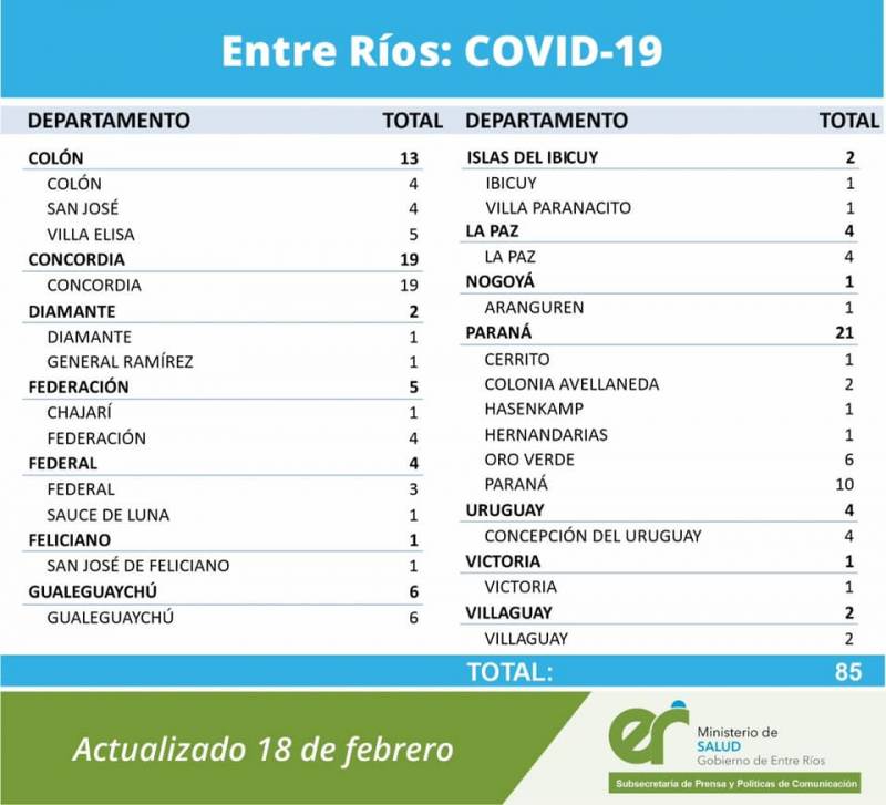 El área de Vigilancia Epidemiológica del Ministerio de Salud, confirmó que en Entre Ríos este jueves se registraron 85 nuevos casos de coronavirus, de los cuales 4 corresponden al Departamento Uruguay y todos son de pacientes de Concepción del Uruguay.