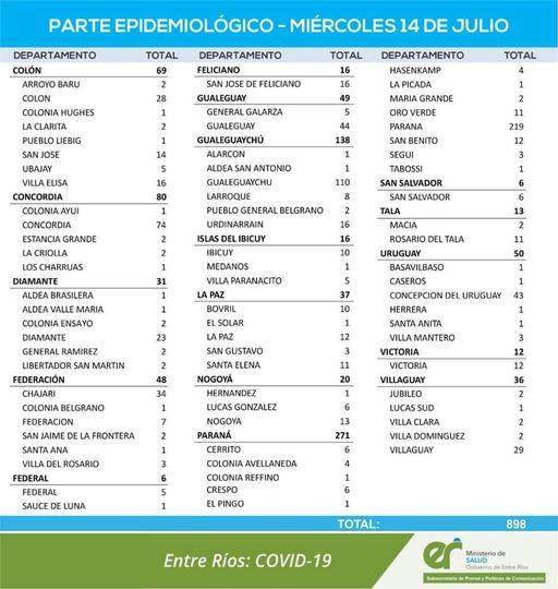 El área de Vigilancias Epidemiológica del Ministerio de Salud, confirmó que en Entre Ríos este miércoles se registraron 898 nuevos casos de coronavirus.