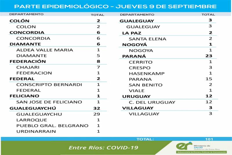 El área de Vigilancias Epidemiológica del Ministerio de Salud confirmó que en Entre Ríos este jueves 9 de septiembre se registraron 101 nuevos casos de coronavirus.