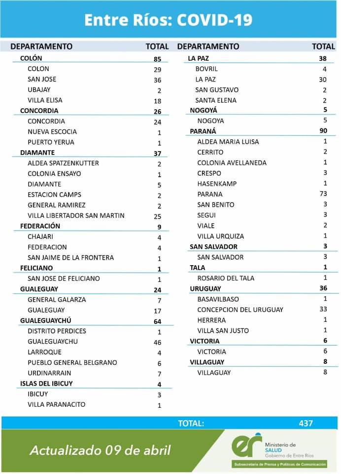 En virtud de los datos reportados este viernes por el área de Vigilancia Epidemiológica del Ministerio de Salud, en Entre Ríos se han sumado 437 casos de coronavirus. En el Departamento Uruguay 36 nuevos casos, 1 en Basavilbaso, 1 en Herrera, 1 en San Justo y 33 en Concepción del Uruguay.