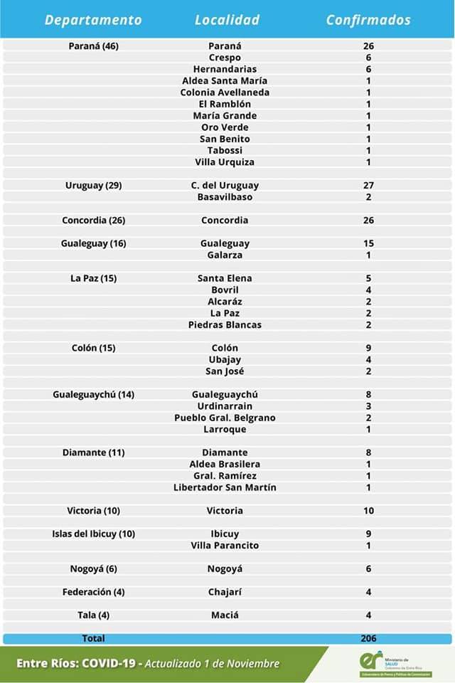 El área de Vigilancia Epidemiológica del Ministerio de Salud, confirmó que en Entre Ríos este domingo se registraron 206 nuevos casos de coronavirus, los que se distribuyen de la siguiente manera: