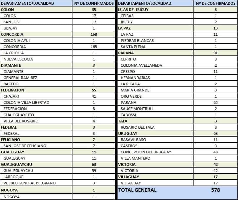 A partir de los datos reportados al 2 de enero de 2021 por el área de Vigilancia Epidemiológica del Ministerio de Salud, en Entre Ríos se han sumado 578 casos de coronavirus.