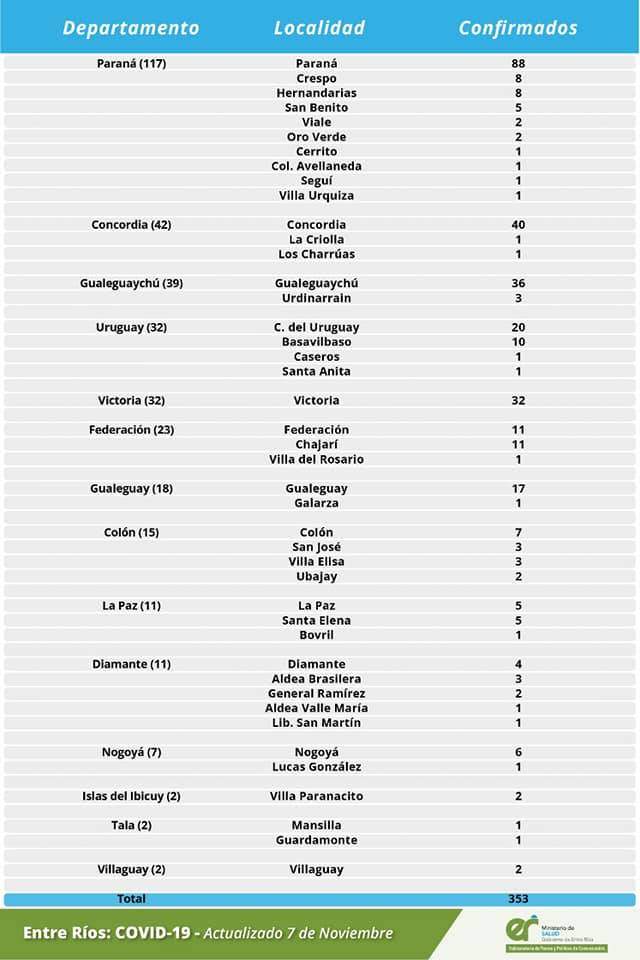 Salud | El área de Vigilancia Epidemiológica del Ministerio de Salud, confirmó que en Entre Ríos este sábado se registraron 352, de los cuales 10 corresponden a vecinos de Basavilbaso y 1 a Santa Anita. El número de casos confirmados, desde que comenzó la pandemia asciende a 18.190 casos.