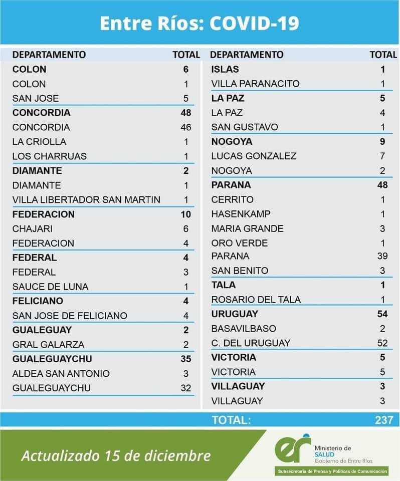 A partir de los datos reportados al 15 de diciembre de 2020 por el área de Vigilancia Epidemiológica del Ministerio de Salud, en Entre Ríos se han sumado 237 casos de coronavirus.