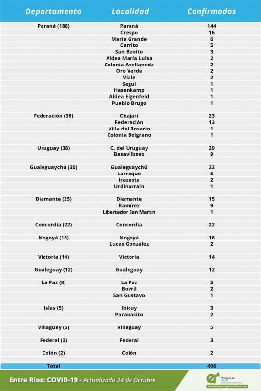La Subsecretaria de Prensa y Políticas de Comunicación del Ministerio de Salud de Entre Ríos, a partir de los datos reportados al 24 de octubre de 2020 por el área de Vigilancia Epidemiológica, en Entre Ríos se han sumado 406 casos de Coronavirus.