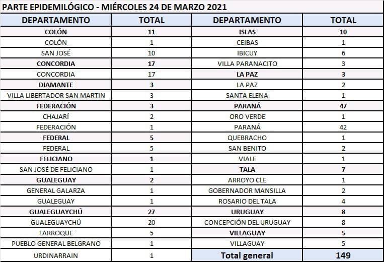 El área de Vigilancia Epidemiológica del Ministerio de Salud, confirmó que en Entre Ríos este miércoles se registraron 149 nuevos casos de coronavirus. En el Departamento Uruguay 8, todos de la cabecera del Departamento.